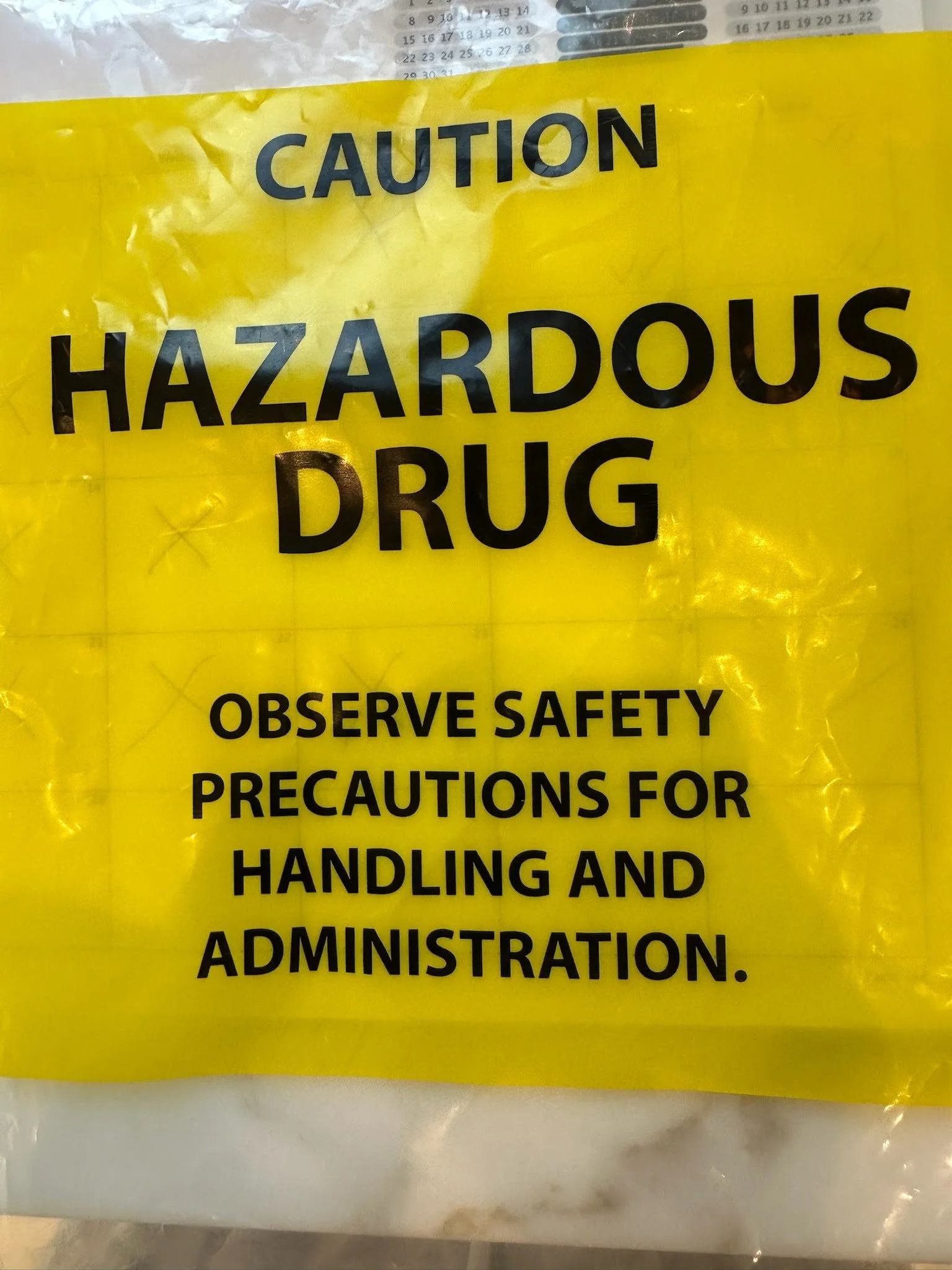 I willfully and happily take the drug, hoping to keep my cancer numbers down. And yet, I take something that clearly warns of its toxic danger. Is my entire being hazardous? Is my body emanating toxicity? I know this isn’t true, but I can’t help but wonder.